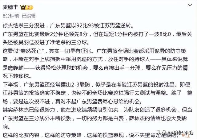 媒体人麦穗丰发文点评:广东男篮在比赛最后2分钟还领先8分,但在短短1分钟内被打了一波8比0,最后关头还被吴羽佳投进了准绝杀的三分球。
